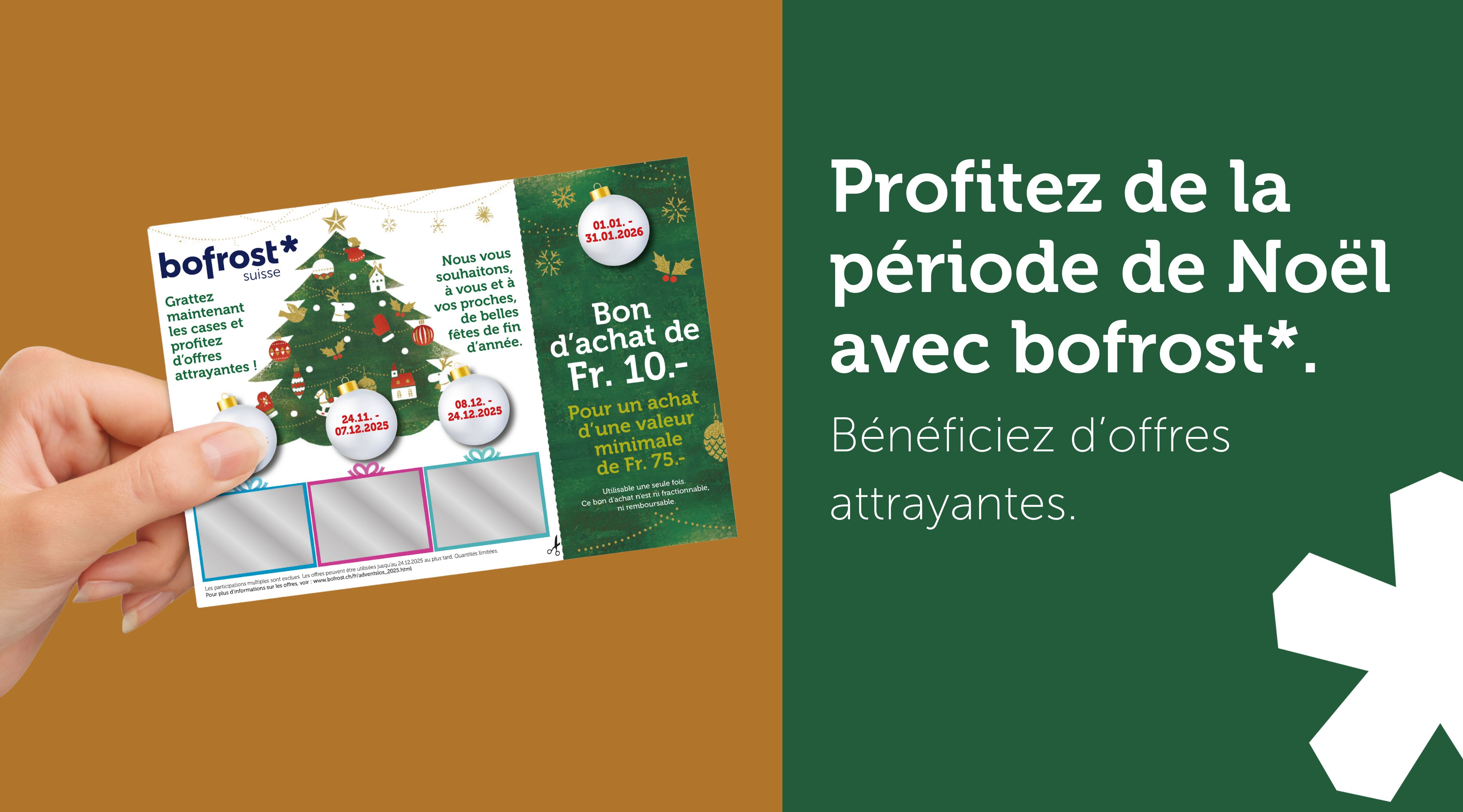 Les participations multiples et les participations de collaborateurs de bofrost* ainsi que de leurs proches ne seront pas prises en compte. Sont autorisées à participer les personnes capables d'agir et domiciliées en Suisse et dans la Principauté de Liechtenstein. La participation de mineurs suppose l'accord des représentants légaux. bofrost* se réserve le droit d'exclure des participants, de supprimer des inscriptions multiples ou d'interrompre la promotion en cas d'incohérence ou de suspicion de manipulation. Les offres ne sont pas transmissibles et ne sont pas payées en espèces. Aucune correspondance ne sera échangée au sujet de la promotion. Dans la mesure où la loi le permet, bofrost* exclut toute responsabilité en rapport avec la promotion, son organisation et l'utilisation des offres. Pour toute question concernant la promotion, les participants peuvent s'adresser à bofrost* : service@bofrost.ch. bofrost* se réserve le droit de modifier à tout moment les conditions de participation. La voie juridique est exclue. Le droit suisse s'applique à la promotion. Les tribunaux de Freienbach/SZ sont seuls compétents pour tout litige en rapport avec la promotion ou les présentes conditions de participation.