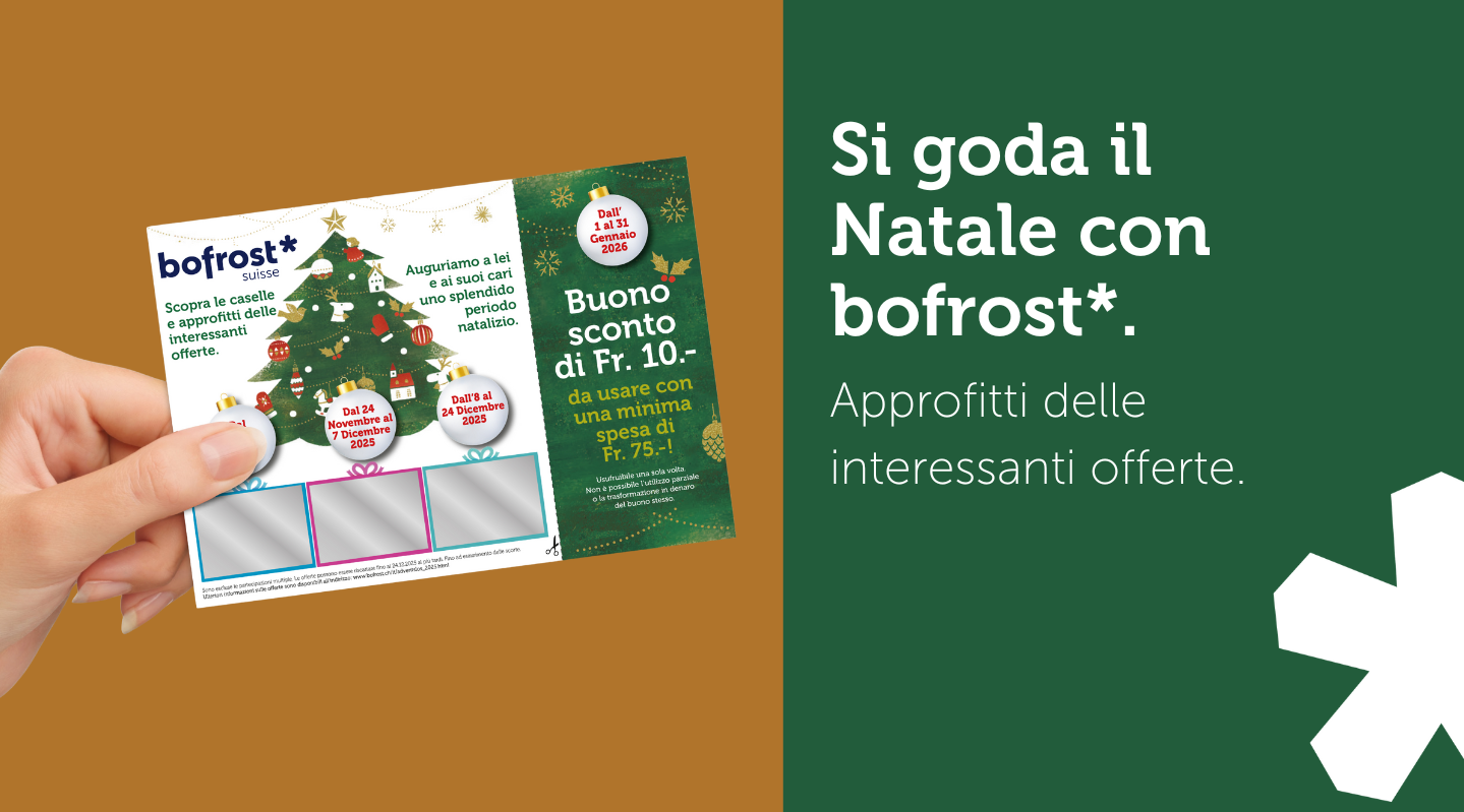 Non saranno prese in considerazione le iscrizioni multiple e quelle dei dipendenti di bofrost* e dei loro parenti. La partecipazione è aperta alle persone con capacità giuridica e residenti in Svizzera e nel Principato del Liechtenstein. La partecipazione di minori richiede il consenso dei loro rappresentanti legali. bofrost* si riserva il diritto di escludere i partecipanti, cancellare iscrizioni multiple o annullare la promozione in caso di discrepanze o sospetti di manipolazione. Le offerte non sono trasferibili e non saranno pagate in contanti. Non verrà avviata alcuna corrispondenza in merito alla promozione. Nella misura consentita dalla legge, bofrost* esclude ogni responsabilità in relazione alla promozione, alla sua organizzazione e al riscatto delle offerte. Se i partecipanti hanno domande sulla promozione, possono contattare bofrost* all'indirizzo service@bofrost.ch. bofrost* si riserva il diritto di modificare le condizioni di partecipazione in qualsiasi momento. Sono esclusi i ricorsi legali. La promozione è soggetta al diritto svizzero. I tribunali di Freienbach/SZ avranno la competenza esclusiva per qualsiasi controversia che dovesse sorgere in relazione alla promozione o alle presenti condizioni di partecipazione.